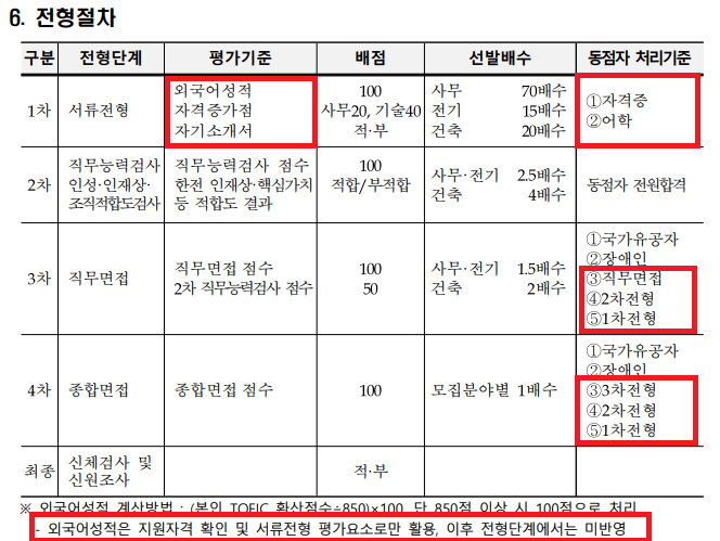 가점을 받을 수 있는 어학과 자격증 부분에서 최대치의 결과를 만들어내야만 동점자 처리에서 허망하게 떨어지지 않을 수 있기 때문이죠. 따라서 영어 성적의 경우 지원 자격이 '토익 700점'이라고 해서 딱 700점을 받게되면 동점처리에서 불리할 수 밖에 없죠.