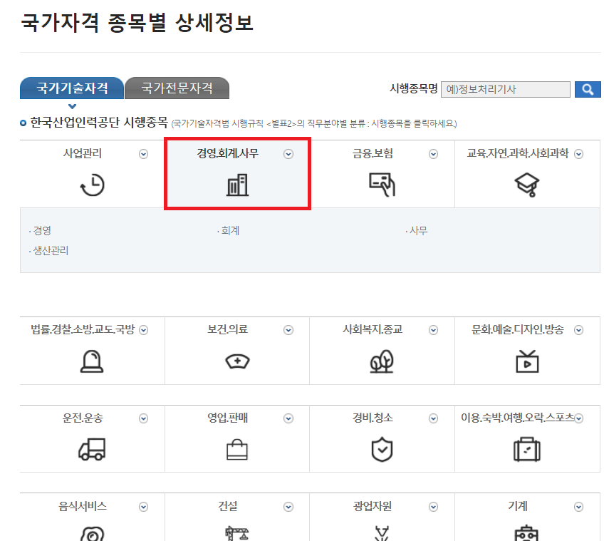 이 외에도 아래와 같이 목표하는 직종을 클릭하면, 해당 그룹 내에 분야별 자격증 정보를 제공하고 있기 때문에
