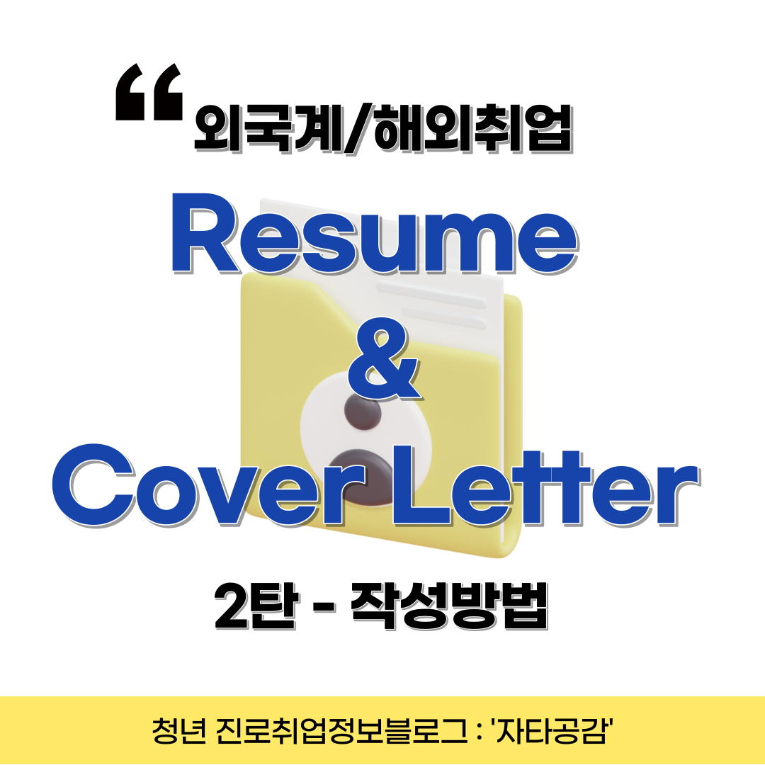 안녕하세요! 자타공감입니다. 오늘은 영문 입사지원서류 작성방법에 대해서 간단하게 소개하겠습니다. 흔히들 '이력서 = Resume', '자기소개서 = cover letter' 라는 방식으로 호환하여 이해하곤 합니