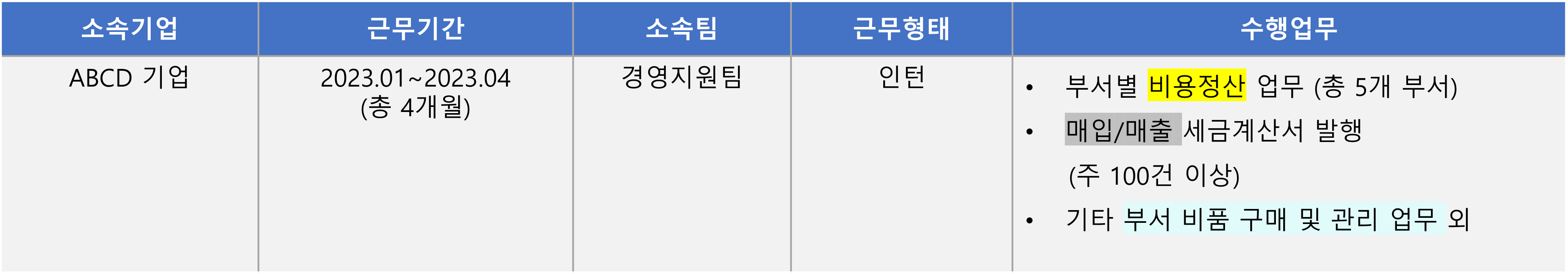 ☞ 근무 기간이 짧을수록 한 두개의 핵심업무에 집중했다는 인상을 주는 것이 중요!