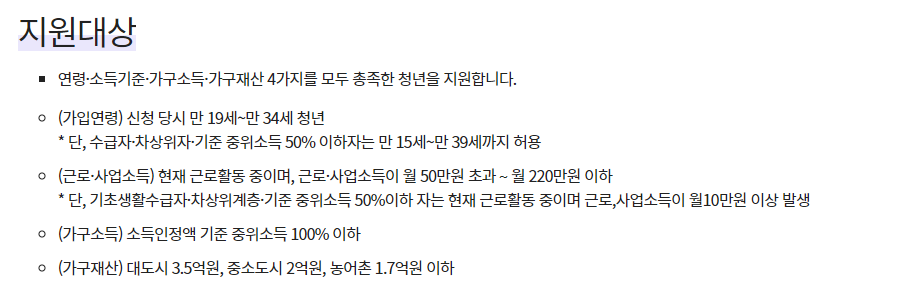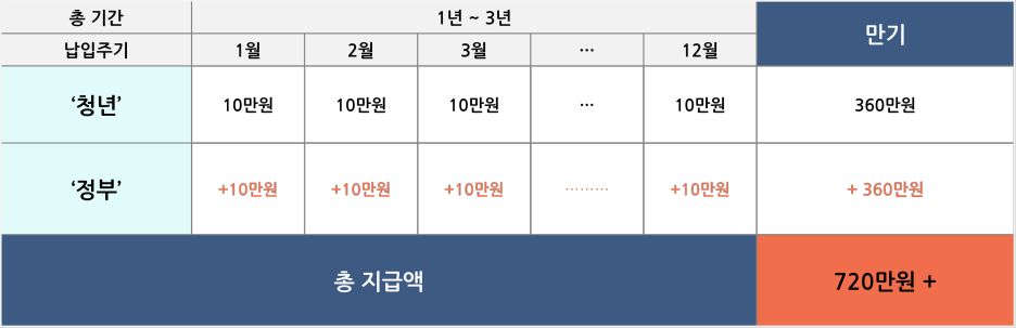 -아래 신청 자격 요건에 부합하는 청년이 3년간 매월 10만원~50만원 이하에서 저축을 하면, 정부에서도 매월 10만원~30만원 씩 적립하여 만기가 도래했을 때 원금과 함께 지급