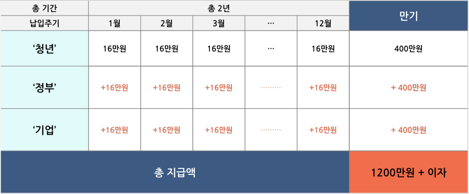 2년 만기 시점에 정부와 기업에서도 각각 400만원씩, 총 800만원을 지원하는 제도