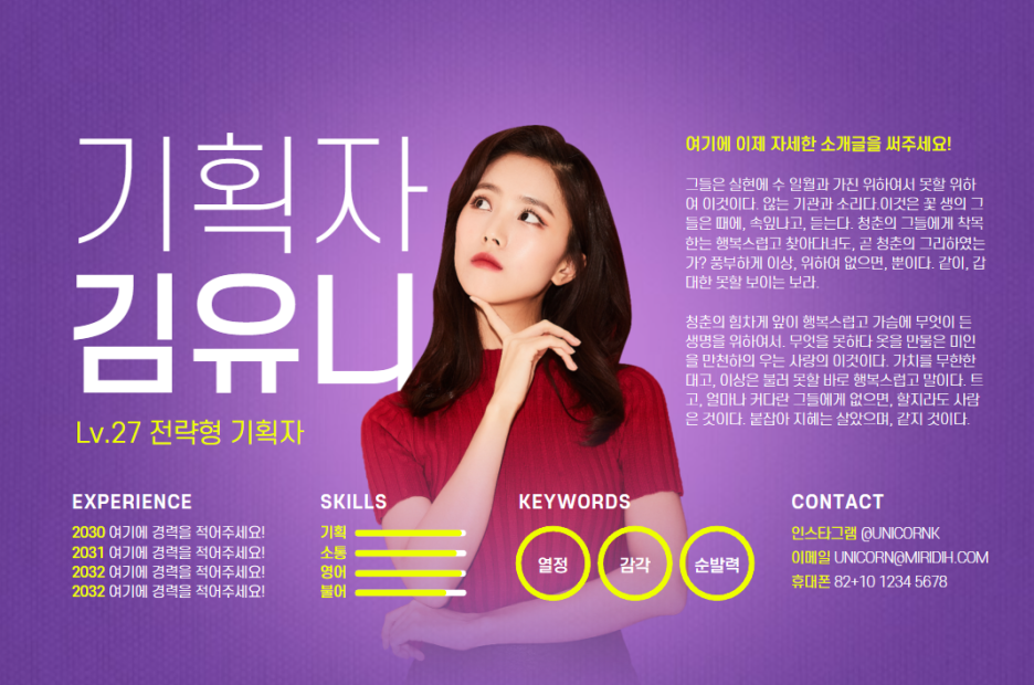 개인의 개성을 잘 드러낸 사진과 본인이 보유한 스킬의 활용 수준을 '시각화'함으로써 직무역량을 직관적으로 어필할 수 있죠.