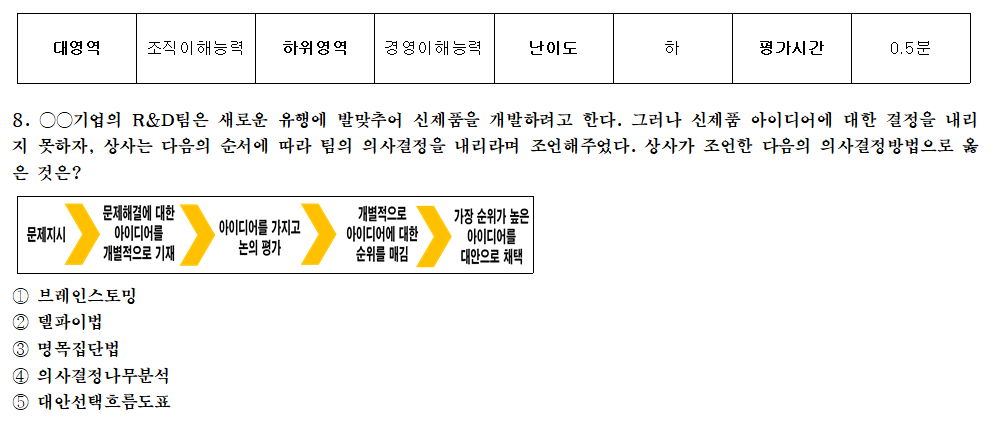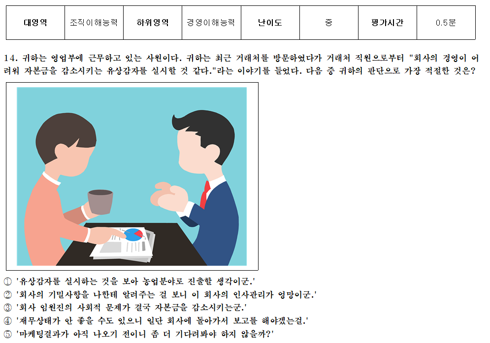 아래는 NCS국가직무능력표준 사이트에서 제공하는 조직이해능력 필기문항 예시입니다.