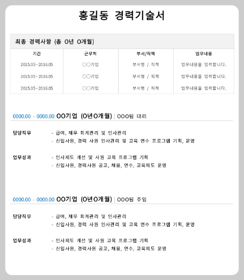 경력기술서 양식은 위의 사항이 포함되어 있다면,