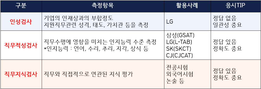 필기전형 유형은 아래의 세 가지 형태로 구분되면 각각의 측정항목 및 특징은 다음과 같습니다.