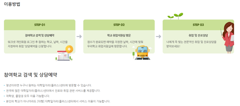 상담신청은 '워크넷 > 우리학교취업지원실'을 통해 예약할 수 있습니다.