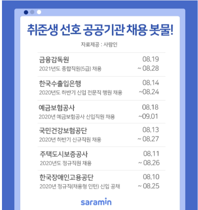 금융감독원, 한국수출입은행 등 구직자의 선호도가 높은 금융 공기업을 비롯해 주요 공공기관들의 채용이 본격화되고 있다. 이에 구인구직 매칭플랫폼 사람인(대표 김용환)이 하반기 채용에 문