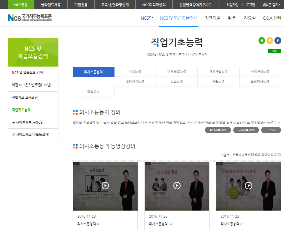 2) NCS 홈페이지 'NCS학습모듈검색' 메뉴 > 직업기초능력 세부내용확인