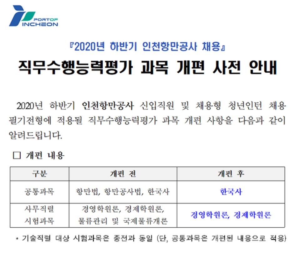 1. 인천항만공사 직무수행능력평가 과목 개편 안내