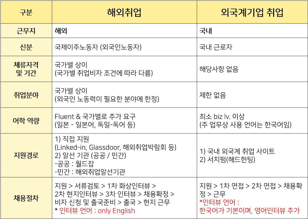 따라서, 내가 근무하게 되는 기업의 본사가 '해외에 있다'라는 사실을 제외하고는 해외취업과 외국계기업 취업 두 가지는